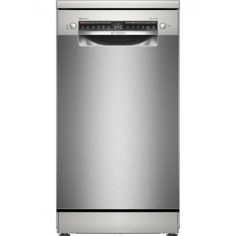 Szabadonálló mosogatógép - Serie4 - Home Connect - Nemesacél - 10 teríték - Energiaosztály:E - 6 program - 4 opció - Nagyméretű LED kijelző - Nyomógombos vezérlés - Hőcserélős kondenzációs szárítás - VarioFlex kosárrendszer - VarioDrawer - 9,5 liter/ciklus - 44 dB(A) re 1 pW - Programok: Eco 50°C, Auto 45-65°C, Intenzív 70°C, 1 h 65°C, Silence 50°C, Favourite/Előöblítés - Opciók: Időzítés (24h), Extra szárítás, IntenzívZóna, SpeedPerfect +, MachineCare, További opciók a HC alkalmazásban - Kijelzés: Só és öblítőszer- hiány, Maradék-idő - Felszereltség: AquaStop, EcoSilence Drive , AquaSensor, Töltöttség szenzor, Háromszoros szűrő rendszer, Regeneráló elektronika, Üvegvédelmi rendszer, DosageAssist, Elektronikus nyomógombzár - Kosárrendszer: Váltókar technika, Állítható felső kosár (Rackmatic), Lehajtható elemek az alsó kosárban (2db), Lehajtható elemek a felső kosárban (2db), Lehajtható pohártartó az alsó kosárban (1db), Lehajtható pohártartó a felső kosárban (1db), Kosármegállító ütközők, Alacsony súrlódású kerekek az alsó kosárban, Alacsony súrlódású kihúzórendszer a felső kosárban - Méretek (mm, ma x szé x mé):845x450x600 - Állítható lábak(mm): max. 20