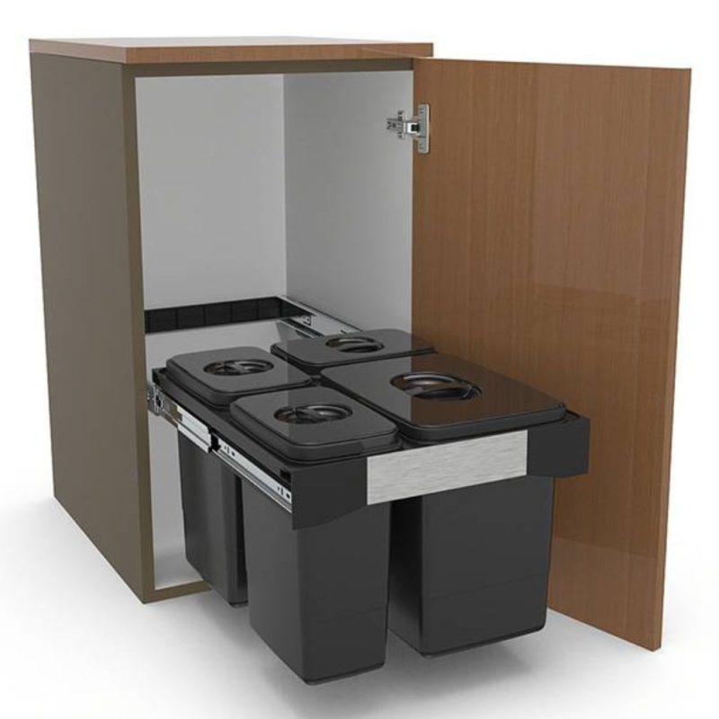 Szekrénybe szerelhető, teljesen kihúzható hulladékgyűjtő rendszer, szelektív hulladékgyűjtéshez.