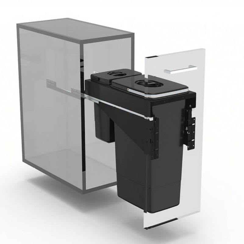 Ajtófrontra szerelhető, teljesen kihúzható, lágyan záródó hulladékgyűjtő rendszer, szelektív hulladékgyűjtéshez.