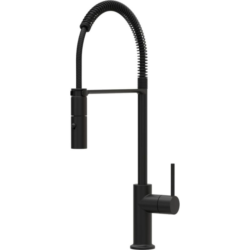 Egykaros félprofesszionális, ívelt, magas, kerámiabetétes csaptelep, oldalsó szabályzóval, forgatható kifolyócsővel, flexibilis zuhanyfejjel, normál beépítéssel, Ø35 mm-es furattal. 3-féle színben rendelhető.
