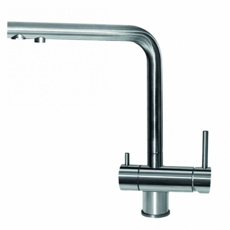 Egykaros álló csaptelep, két elosztó szeleppel, kerámiabetéttel, oldalsó szabályzókkal, elforgatható kifolyócsővel, víztisztító rendszerekhez is alkalmazható.