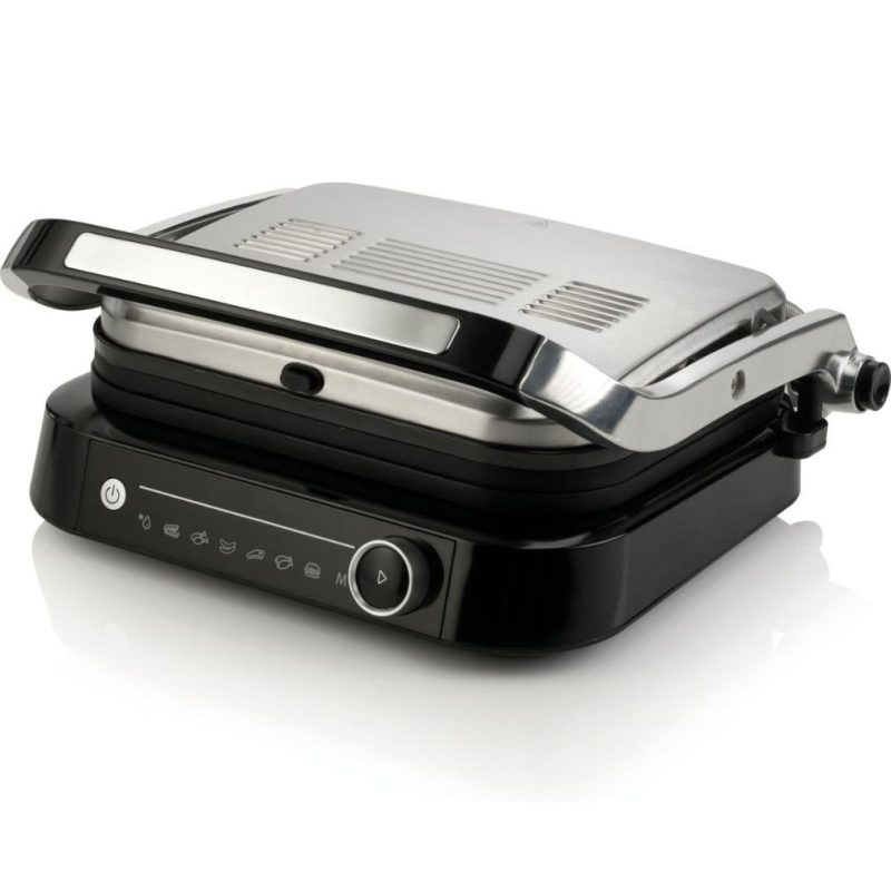 -állítható pozíciók: a kontakt grill lapjainak távolsága a grillezett étel vastagságának megfelelően állítható, illetve a felső sütőlap teljesen ki is hajtható, így a készülék klasszikus asztali grillként is használható