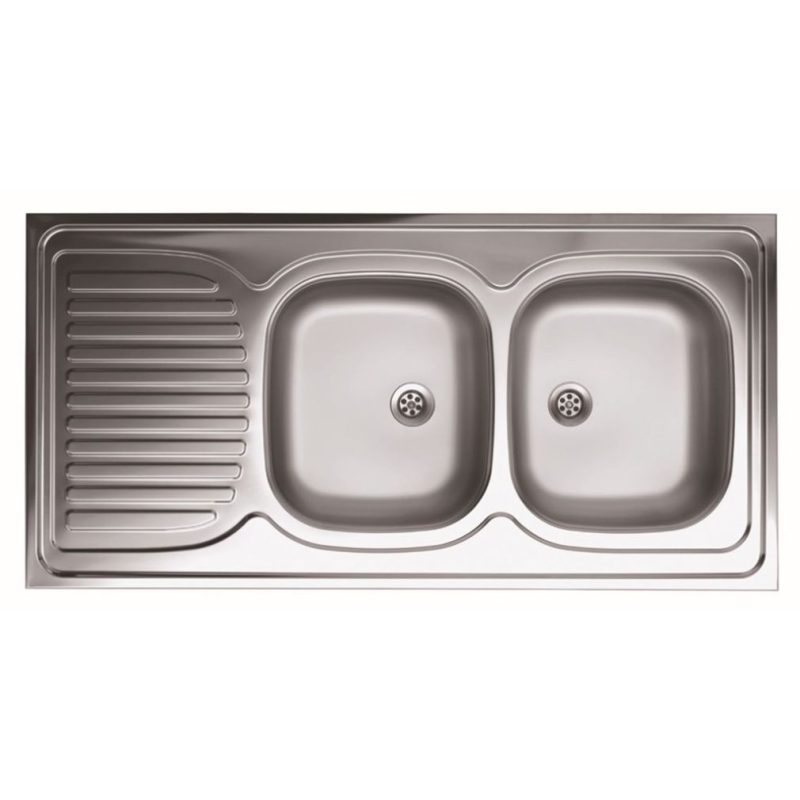 LIVINOX kétmedencés, csepptálcás, teletetős rozsdamentes acél mosogató, jobbos medence, 1 1/2" lefolyógarnitúrával. Felhajtott hátsó perem. Mérete: 1200 x 600 mm, medence mélység: 135 mm. Bűzelzáró szifon alaptartozék.