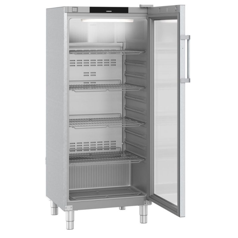 bruttó 600 literes hűtőszekrény; ventilációs hűtési rendszer; zárható hőszigetelt ESG biztonsági üveg ajtó; kapcsolható felső LED világítás; LightAlarm: riasztás fényjelzéssel; hűtési tartomány: +1/+15°C között; 3 fokozatban állítható páratartalom; SuperCool funkció; ajtóba integrált érintőgombos monokróm kijelző; digitális hőmérsékletkijelzés; optikai és akusztikus riasztási funkciók: eltérő hőmérséklet, ajtó nyitva maradás és áramkimaradás esetén, az áramellátás helyreállásával; integrált adatmemória: elmúlt időszak (kb. 42 nap) min/max. hőmérsékleti értékeinek eltárolása és kijelzőn történő megjelenítése; billentyűzár funkció; nyomáskiegyenlítő szelep; kívül rozsdamentes acél burkolat; egy darabból készült, hőformázott, szürke színű polisztirol (környezetbarát) belső burkolat; elpárologtató védőburkolat; tisztító nyílás; 4 db megerősített, GN 2/1 méretű, szürke színű védőbevonatos acél rácspolc, STOP funkcióval; padlórács; a polcok magassága 100 mm-ként állítható; polconkénti terhelhetőség: max. 60 kg; az ajtó 90°-os nyitási szög felett nyitva marad, ez alatt önműködően csukódik és nyitásának iránya megfordítható; higiénikus, cserélhető ajtószigetelés; ergonomikus alumínium fogantyú; automatikus leolvasztás; rozsdamentes acél 150-180 mm között állítható lábak; FCKW-FKW mentes hűtőközeg (R 600a) és falszigetelés (43 mm); külső hőmérséklet: +10/+40°C között - 4. klímaosztály; FFFCvg 5501 mélyhűtővel párba állítható; éves energiafogyasztás: 1041 kWh; E energiahatékonysági osztály